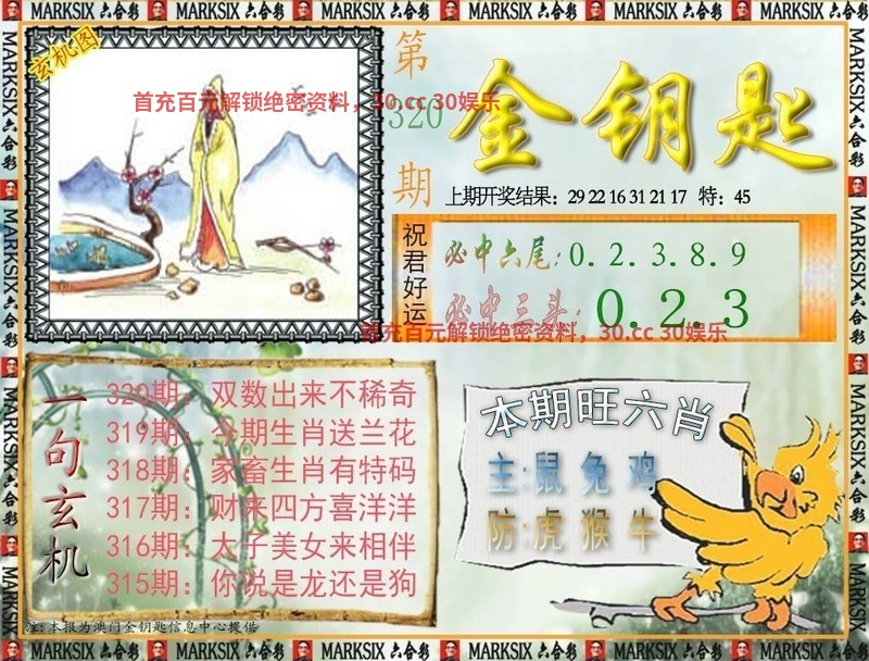 319期一字記曰:【奔】 为口奔驰,为势所逼,羽翼未丰也抢食。一分收获,十分努力,适者生存要积极。 玄机测字《注》 解:含桃庄主后园深:后园深解后肖狗鸡猴猪马羊。 综合取肖:狗鸡猴猪马羊 |